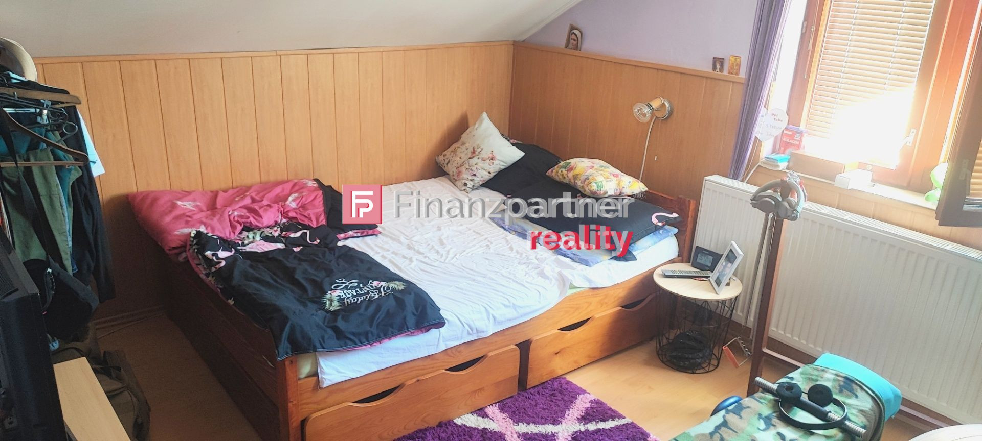 Na poschodí sa nachádzajú tri obytné miestnosti, kúpeľňa s vaňou a WC.