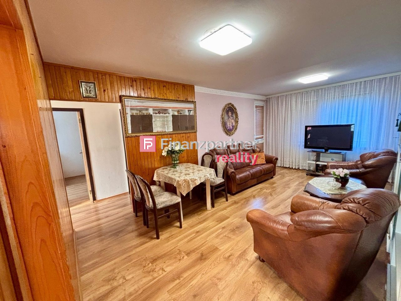 Svetlá a priestranná obývacia izba prepojená s kuchyňou a priamym výstupom na balkón s výhľadom na Žitnoostrovské múzeum