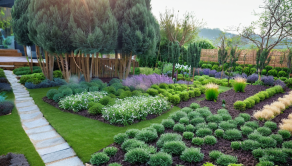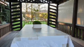 Chcete si len tak posedieť a oddychovať? Pripravený je altán s dreveným nábytkom v tieni borievok s vôňou levandule .