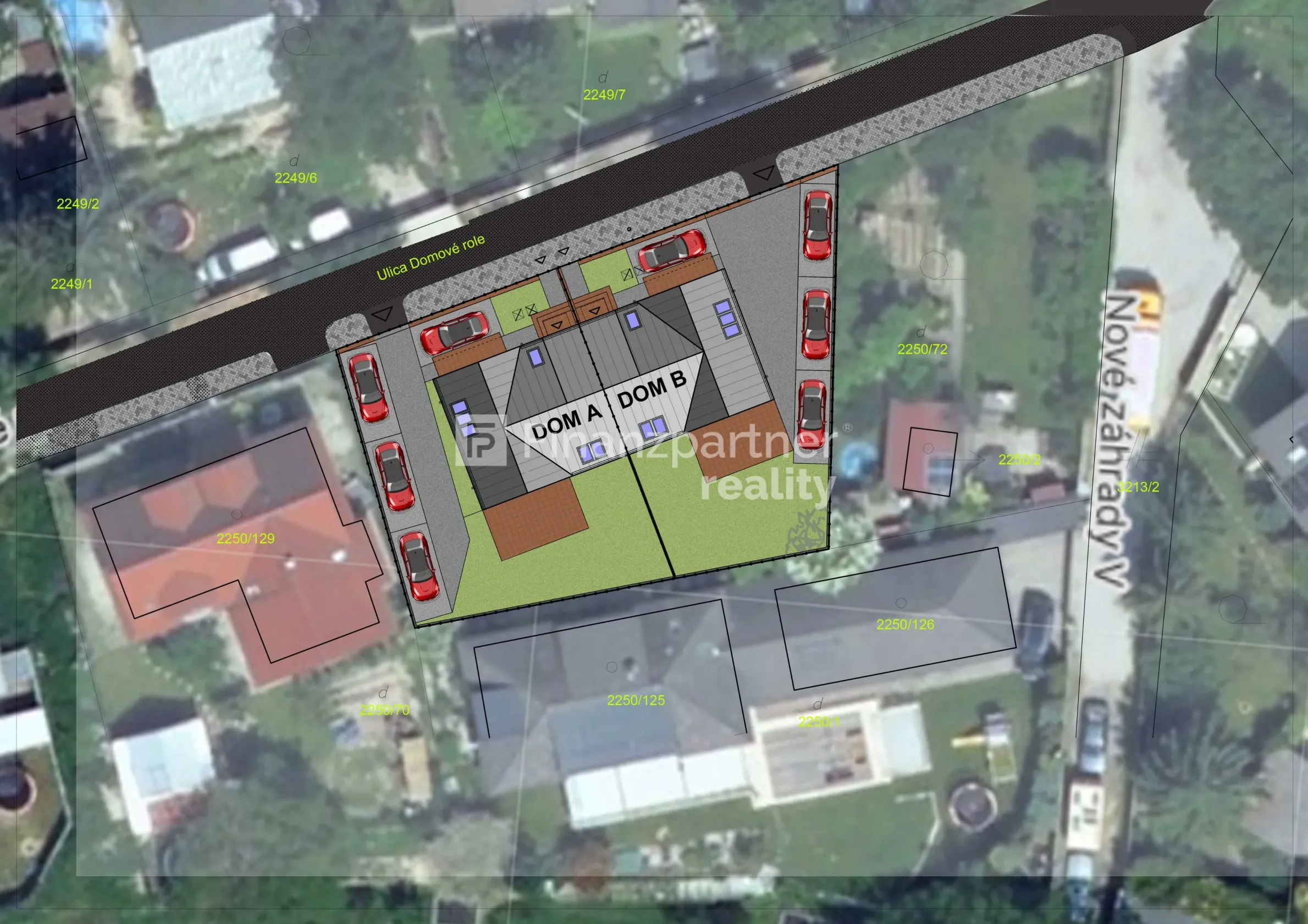 Každému domu prislúchajú **štyri parkovacie miesta**, ktoré zabezpečujú pohodlné parkovanie pre rezidentov aj návštevy.