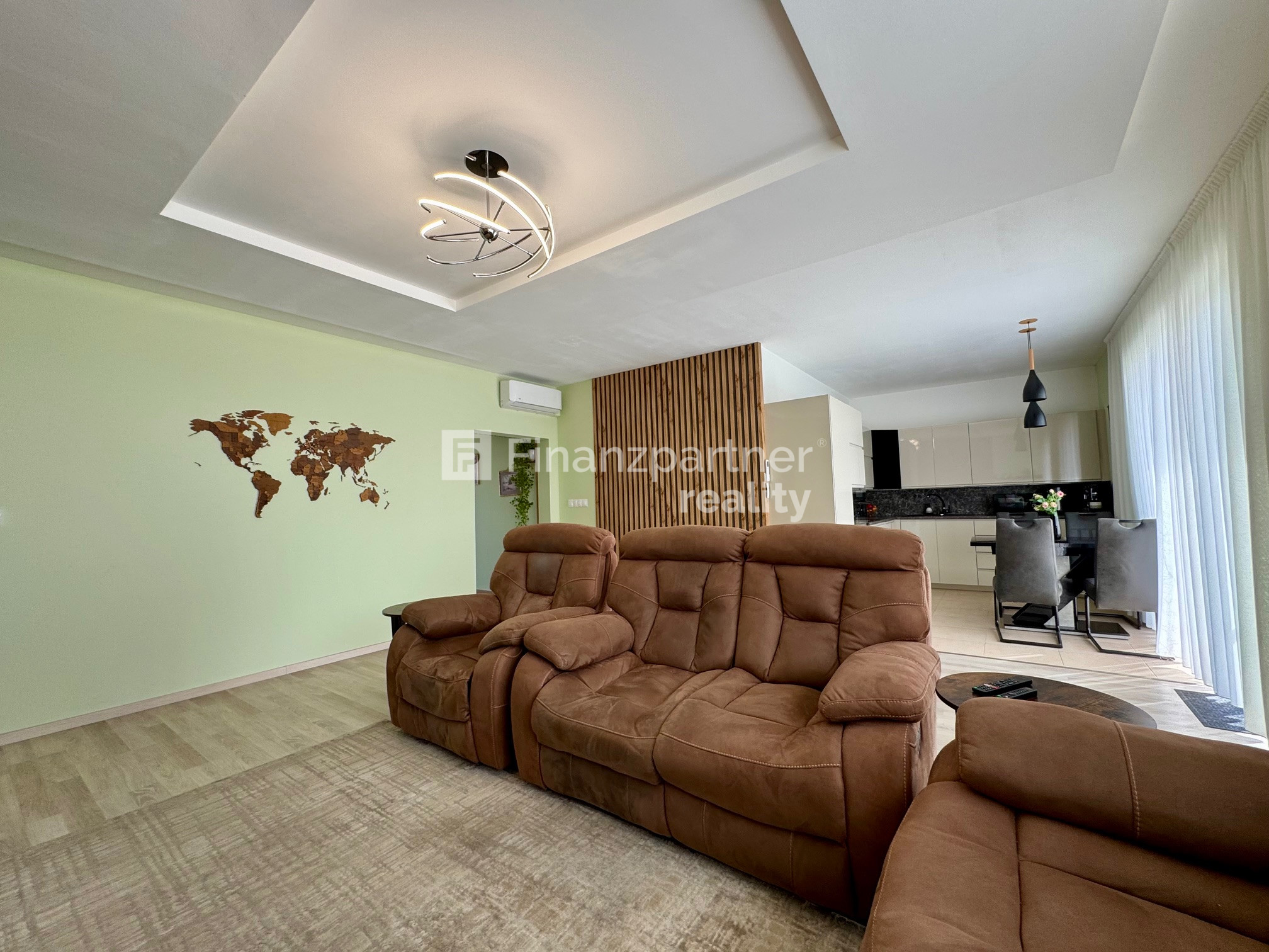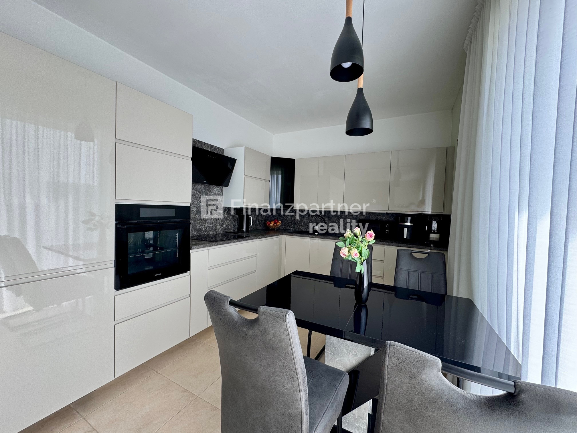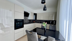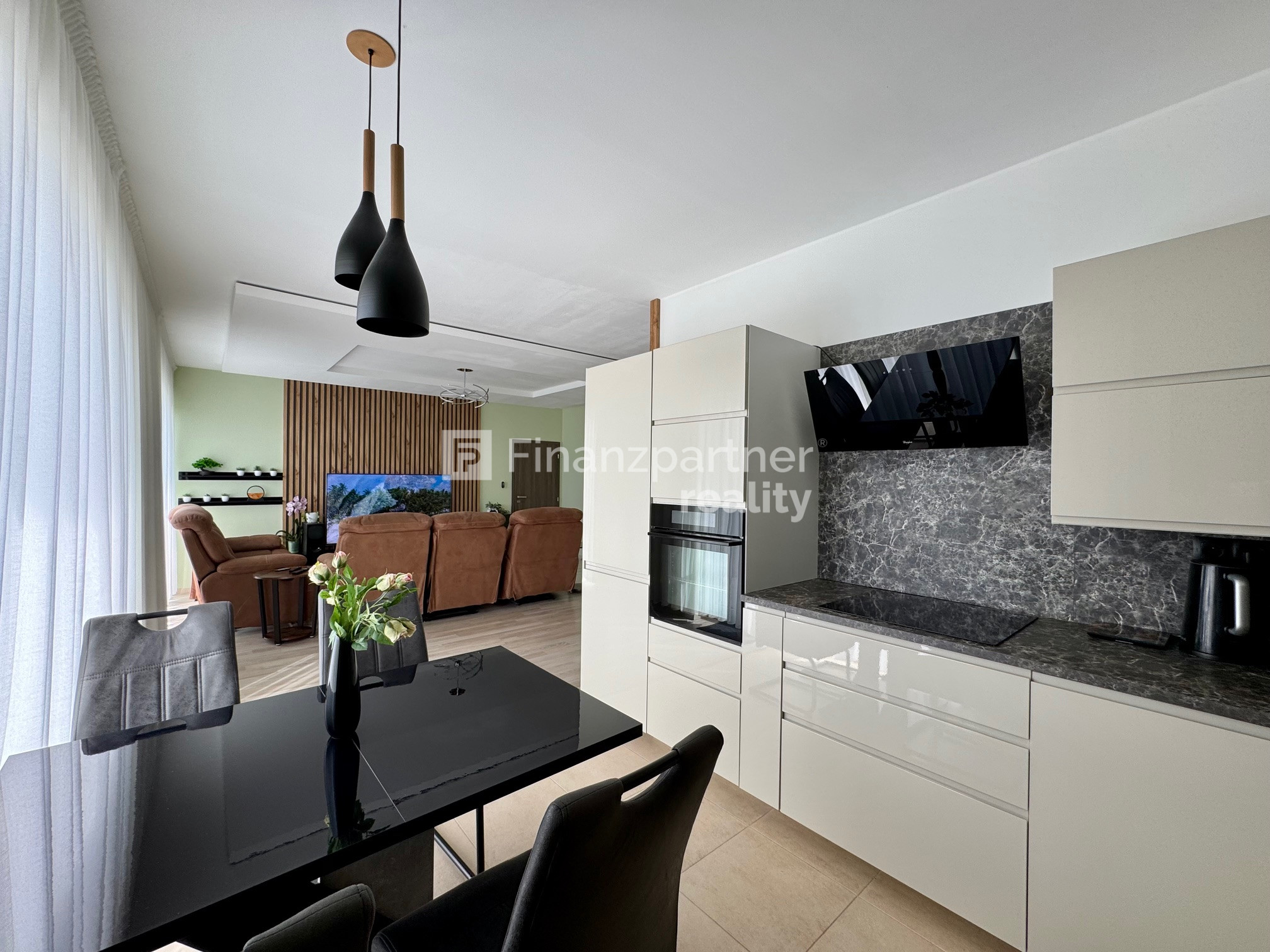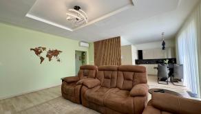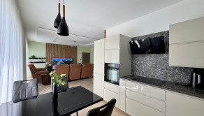 Denná časť a Kuchyňa: Priestranná obývačka so zníženými stropmi a kuchyňa so vstavanými spotrebičmi (elektrická rúra Gorenje, zabudovaná chladnička s mrazničkou, digestor Whirlpool).