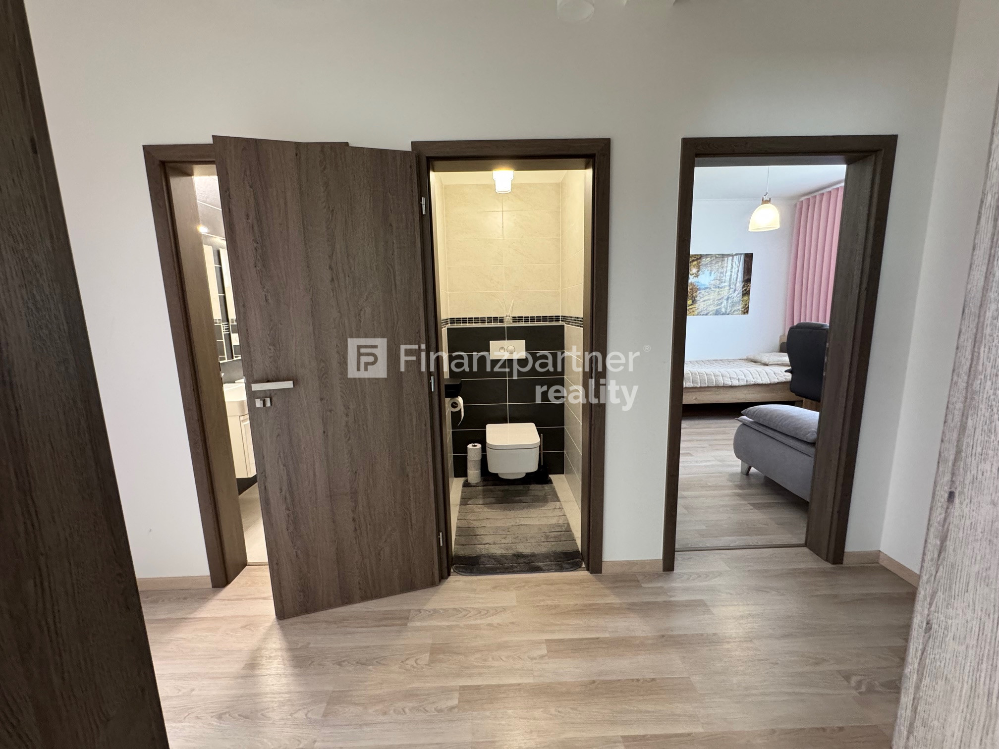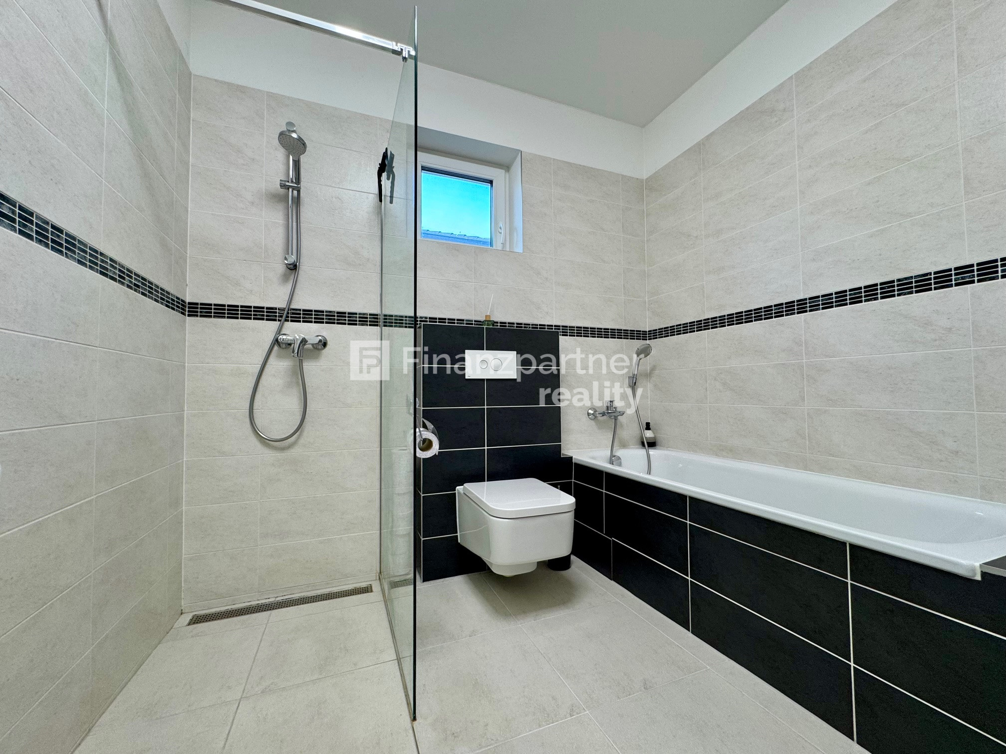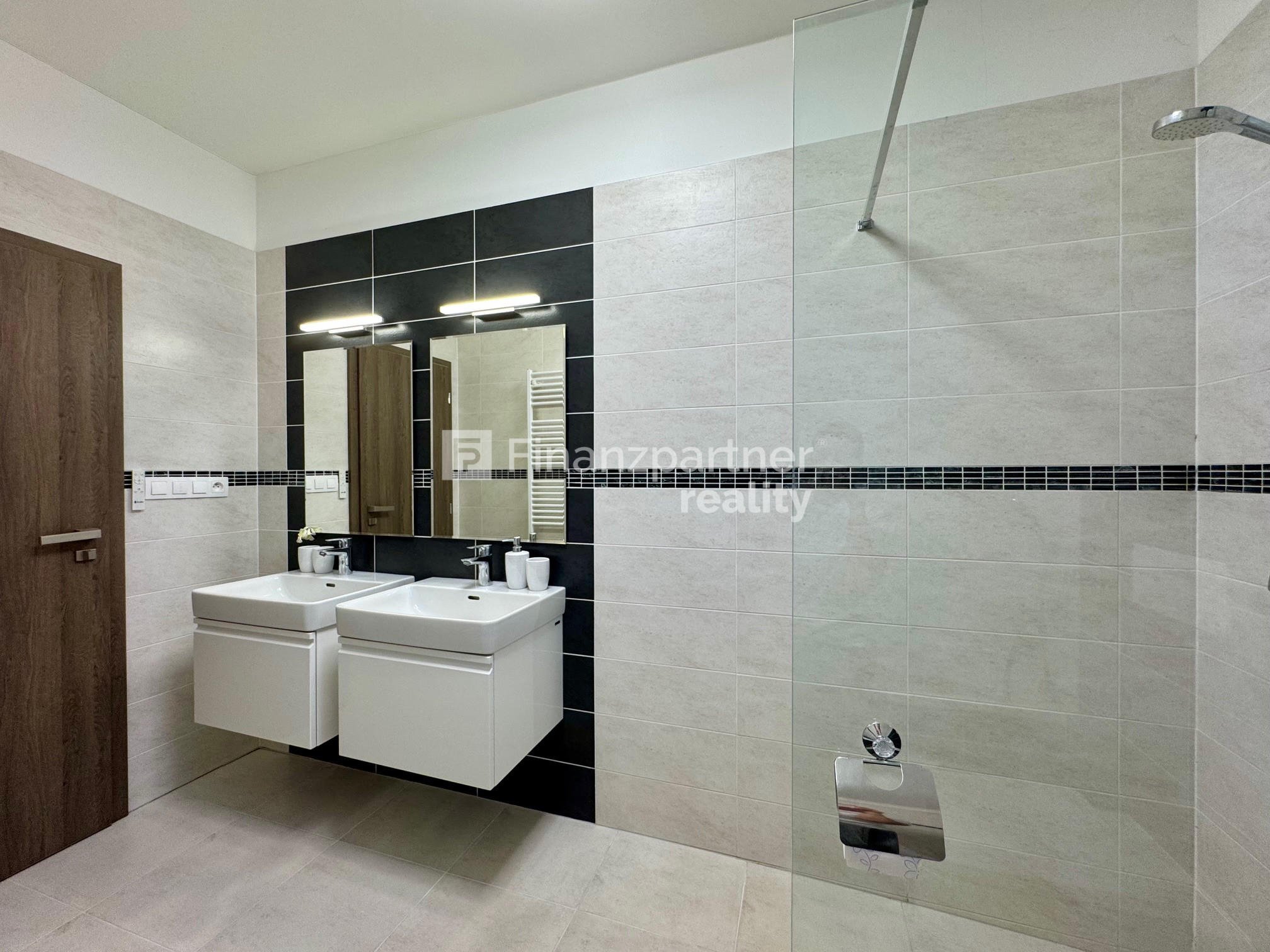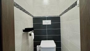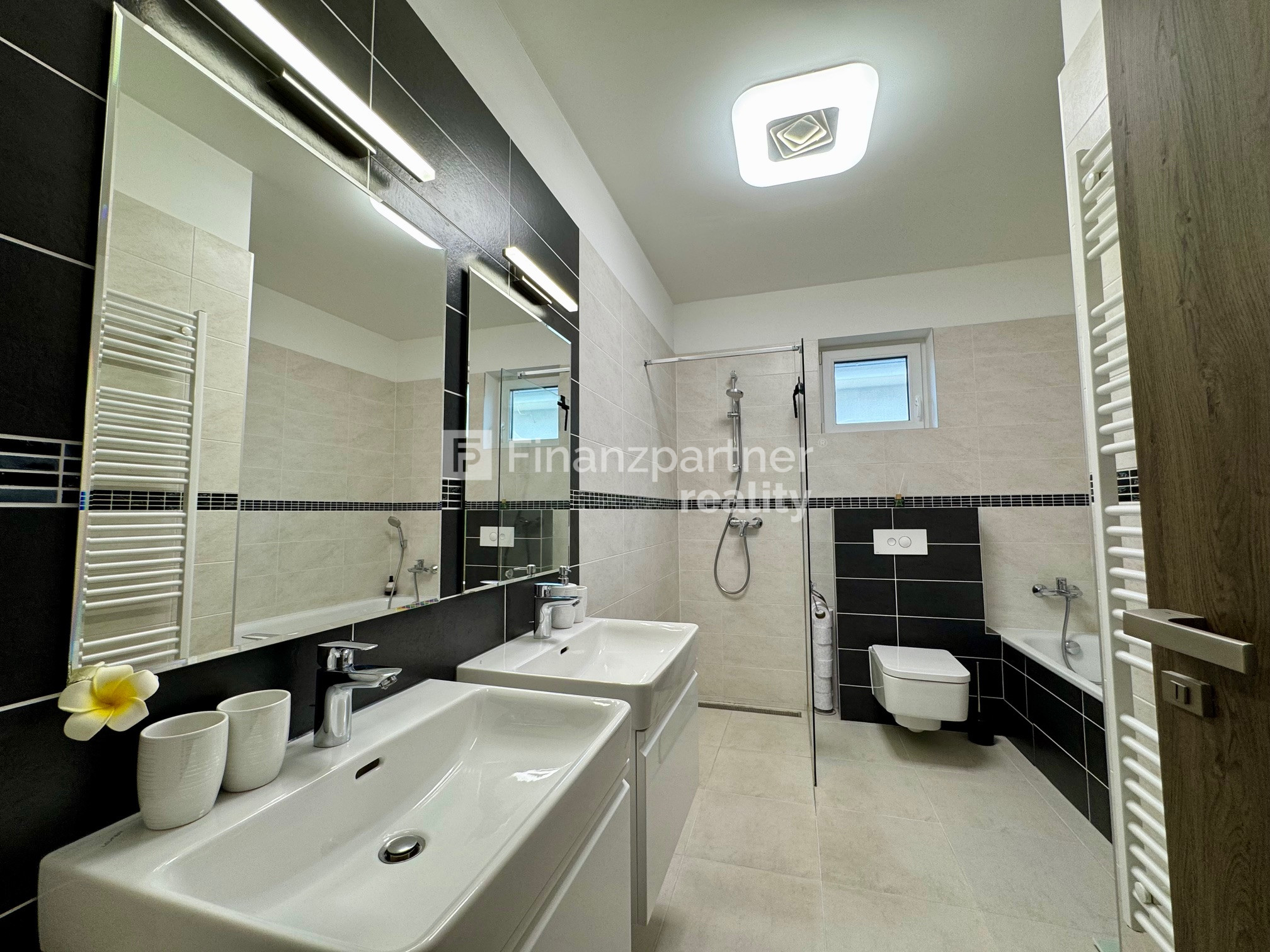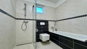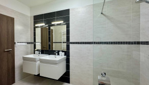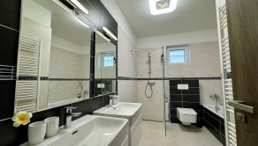 Kúpeľňa: Dizajnová kúpeľňa s vaňou aj walk-in sprchovým kútom, dvomi umývadlami a WC. K dispozícii je aj ďalšie samostatné hosťovské WC.