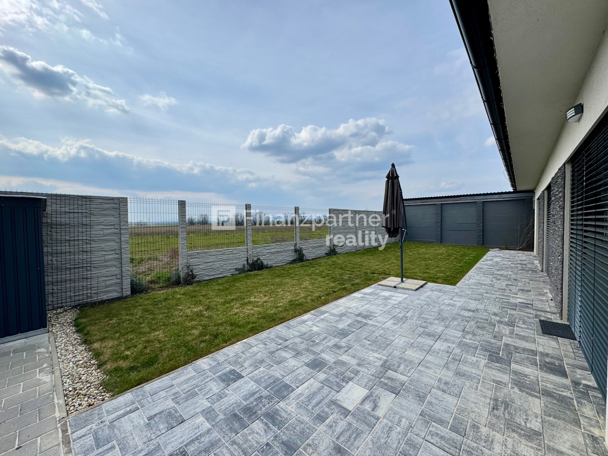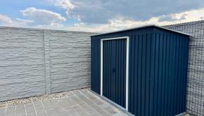 Exteriér: Nový, pevný betónový plot na celom rovinatom pozemku zabezpečuje 100% súkromie.
