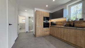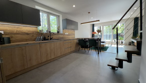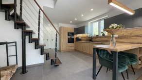 • Prízemie: Vstupná chodba, moderná kúpeľňa, samostatné WC a praktická špajza. Srdcom domu je prepojená kuchyňa s obývacou izbou, z ktorej je priamy výstup na krásnu terasu – doslova stvorenú na letné grilovačky či rannú kávu.